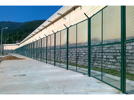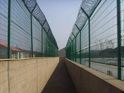 監(jiān)獄圍欄主要是采用高強(qiáng)度的刀片刺網(wǎng)與普通防護(hù)網(wǎng)的結(jié)合,由V型支架立拄,加強(qiáng)型焊接片網(wǎng),安全防盜連接件和刀片刺網(wǎng)組成.刀片刺網(wǎng)是一種新型防護(hù)網(wǎng),由銳利尖角鍍鋅鋼板或不銹鋼薄板做刀片,鋼絲做芯線組合而成的防護(hù)器材。