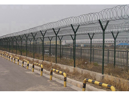 飛行區鋼筋網圍界網面是由直徑5mm的鋼筋排列成矩形網格點焊形成,相鄰橫筋間距不大于10cm,相鄰豎筋間距不大于5cm.每片鋼筋網片寬度不大于3m,用螺栓固定在事先埋設好的立柱上.為增加圍界的穩定性,一般每30m左右增加一個斜撐.圍界上部50—60cm以30.一45.角向外傾斜,或設置滾筒形刺鐵絲網防止攀越。