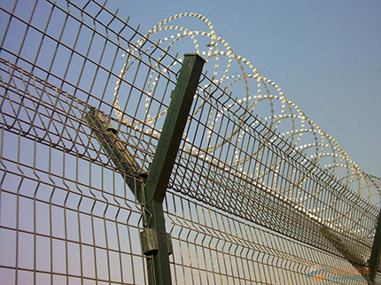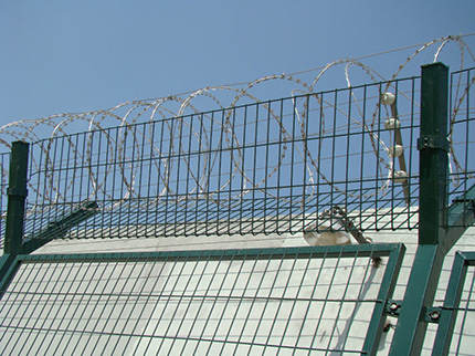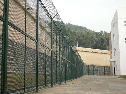 監(jiān)獄防護(hù)網(wǎng)主要是采用高強(qiáng)度的刀片刺網(wǎng)與普通防護(hù)網(wǎng)的結(jié)合,V型支架立拄,加強(qiáng)型焊接片網(wǎng),安全防盜連接件和刀片刺網(wǎng)組成.刀片刺網(wǎng)是一種新型防護(hù)網(wǎng),由銳利尖角鍍鋅鋼板或不銹鋼薄板做刀片,鋼絲做芯線組合而成的防護(hù)器材。